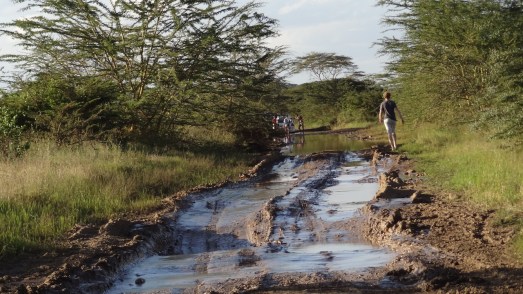 Goed, onderdelen gevonden, de auto na een dag of vier gemaakt en in de laatste nacht voor vertrek breekt dan net de kleine regentijd los. Als dit “klein” is dan moet zijn grote broer een ware zondvloed betekenen want WAT een water!! Al rijdend heb je het gevoel je in een subtropisch waterparadijs te begeven, vol met stroomversnellingen en glijbanen. Een heuveltje af en je ziet een plas water voor je waarvan je niet weet of je je in het ondiepe of het diepe zult begeven. Een dappere poging strandde op de duikplank van het onbekende en we zijn maar omgekeerd. De volgende dag het water grotendeels gezakt, de grens met Ethiopie net gehaald, of beter gezegd: nét niet!! 100m voor de grens zoals weergegeven op de GPS viel de koppelingdruk weg en bleef de versnelling in z’n 1 vast staan, motor viel uit, schuin bovenop een zandheuvel. Top! Weer onder het oude beest gekropen, lekker rustig sleutelen zo in een gebied daar waar het tribaal geweld nog van alle dag is, maar de koppelingdruk weer op weten te poetsen en dan eindelijk: Ethiopie. Ook daar heeft de koppeling het wederom opgegeven, nu door het gehele hydraulische systeem dat versleten is, en bleken de wiellagers tot moes gereden én de aandrijfas gebroken. Nu dan ook maar professionele hulp gezocht in Addis Ababa, de hoofdstad van dit prachtige land, onderwijl genietend van het idee later als twee oudjes de Panamericana af te rijden in een éche Toyota…