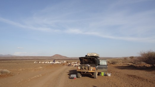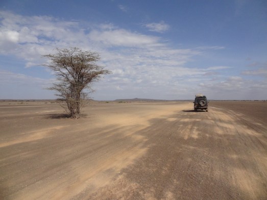 Na een volle week Nairobi binnenstebuiten te hebben getrokken, op zoek naar de juiste banden voor de vierwieler en een slag om de juiste visa voor de Landen der Belachelijke Bureaucratie in het verschiet waren we wel weer toe aan een verzetje. Om door het noorden van Kenia de grens met Ethiopie te bereiken kun je linksom, de beruchte Lake Turkana route, of rechtsom, de zogeheten Moyale route. “Turkana” is het synoniem voor “van god en alles verlaten” en kun je in één adem noemen met 1500 kilometers op onverharde weg, 210 liters diesel in de achterbak en 60 liters water in de bidon en u begrijpt: deze route had dan ook sterk onze voorkeur! Het overgrote voordeel van deze route, in tegenstelling tot de Moyale, is dat er bij Turkana een kleinere kans is op bandieten in het struikgewas. Maar helaas. Nog maar net goed en wel op weg en even gestopt om een jerrycan die van het dak was gevallen opnieuw vast te binden komt er een auto langs. Een blanke achter het stuur, duidelijk vergroeid met zijn omgeving, stopt voor een kort praatje en roept nog uit het raam terwijl hij wegrijdt: “en o ja, ik zou hier niet te lang blijven staan, er zitten hier vrij veel bandieten langs de kant van de weg!!” Goed, wij stappen weer in.