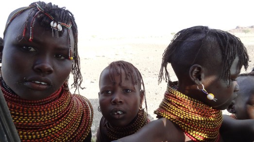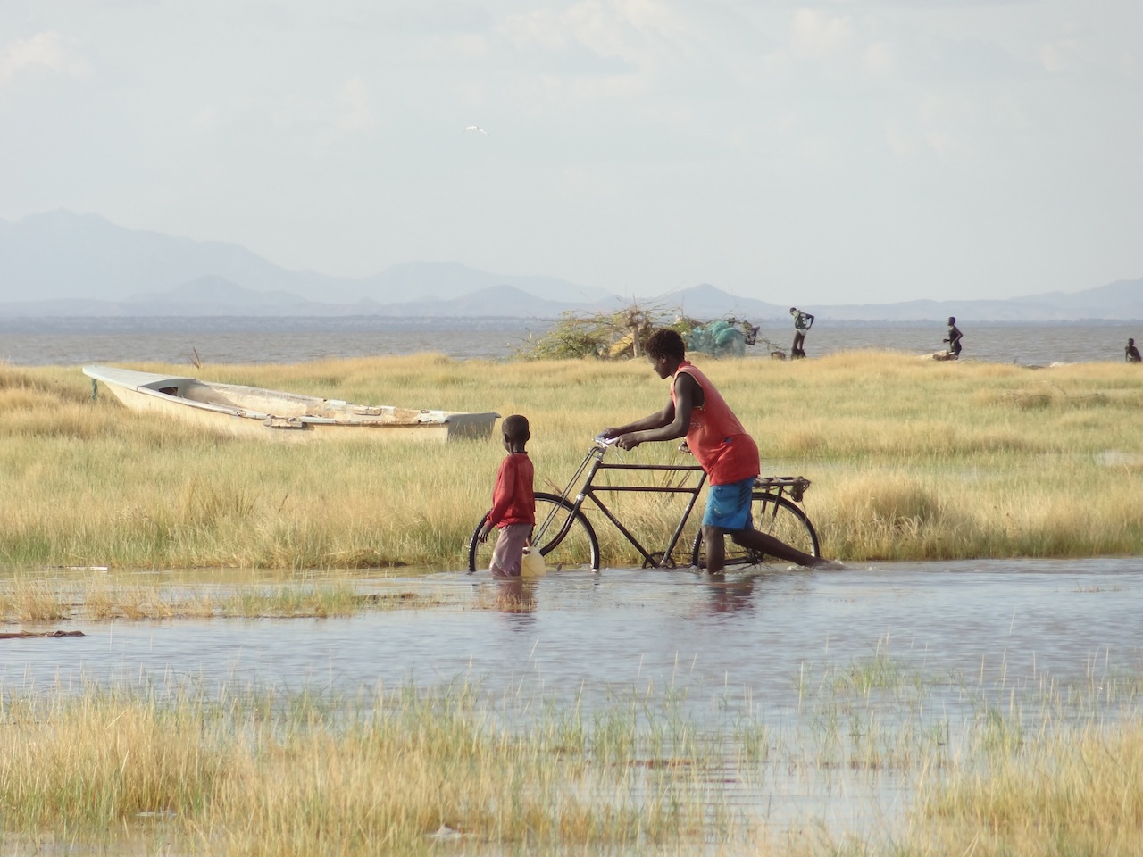 Een indrukwekkende tocht is het geworden, zeker aangezien je na de jungle zo rechtuit de desert in rijdt en het contrast niet groter kon zijn. In de smorende hitte, een föhne die constant op standje 9 in je gezicht blaast, de dorre droogte en tussen al het vulkanisch gesteente is het leven er keihard en zie je behalve een sporadisch acaciaboompje geen verdere tekenen van leven. Eenmaal bij Lake Turkana zie je dan mensen aan je raampje voorbij trekken waarvan je eigenlijk altijd hebt gedacht dat ze een afrikaans cliché vormden en dat dergelijke ‘tribes’ niet meer van deze tijd zijn. Het tegendeel is waar. Versierd met kraaltjes en gekleed in een doek ter grootte van een servet stappen deze mensen met speren tussen de lava door, hobbelend achter een kudde geiten, ossen of kamelen aan. Bij die eerste aanblik wrijf je het stof uit je ogen om zeker te zijn dat de hitte je niet teveel is geworden, maar het is écht. WAT een andere wereld. En dan te bedenken dat precies in dit gebied de overblijfselen zijn gevonden van onze eerste voorvaderen: het is de wieg der mensheid. En het ziet er nu zoveel miljoenen jaren later eigenlijk nog bijna hetzelfde uit, toch grappig!!